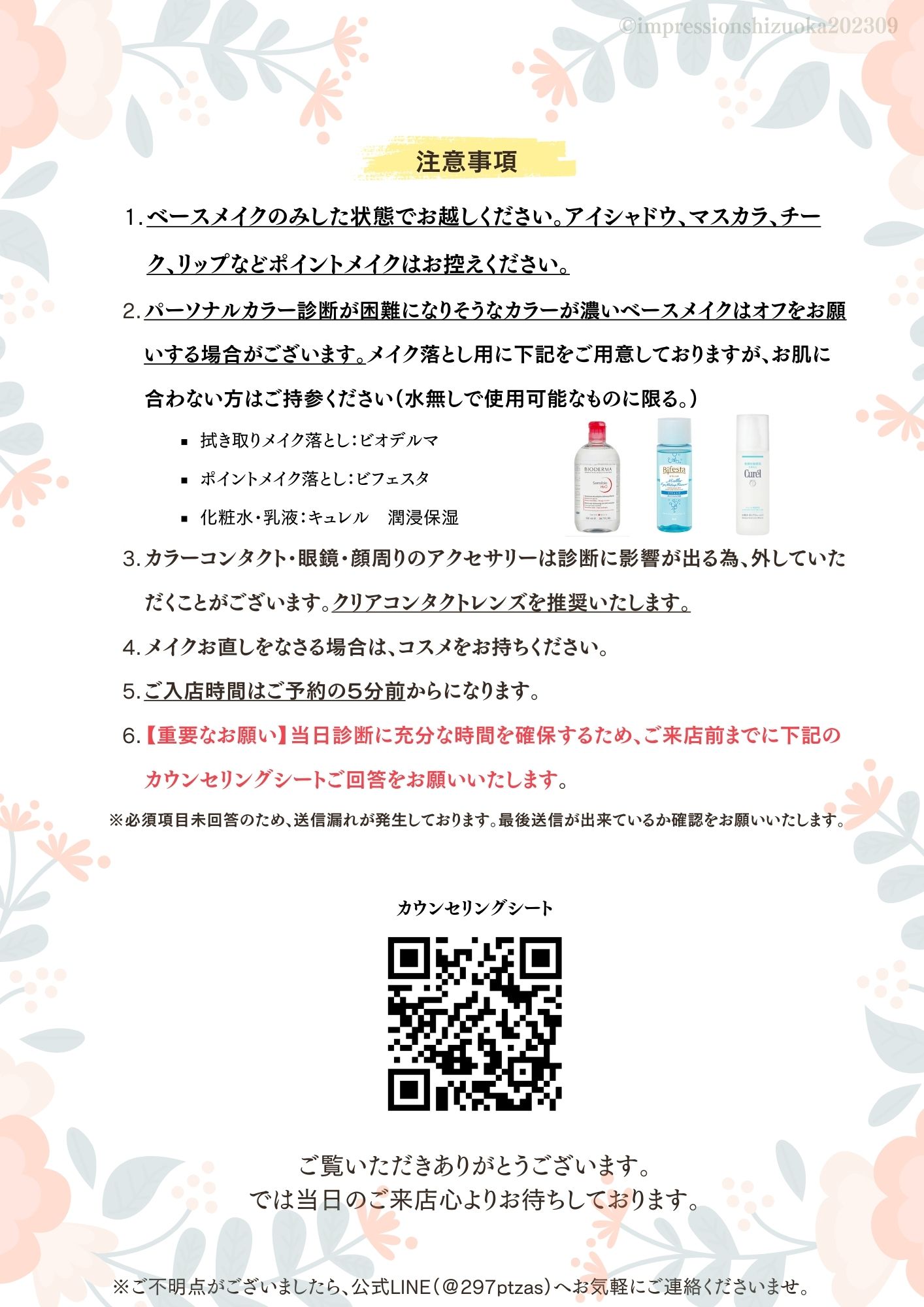 併せてお時間がございましたら事前のカウンセリングシートのご回答もお願いいたします。