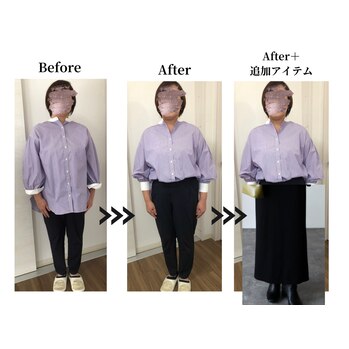 上記は、ご来店時にお召しになってらしたお洋服を骨格・顔タイプ診断結果をもとに変化させたもの。骨格ストレートは腰高が良さがあるので、ウエスト位置は出した方がスタイル良くなります。ただし上半身の立体感もあるので、それは首元を大きく開けて緩和。更に袖の幅も細めにすると素敵です♪