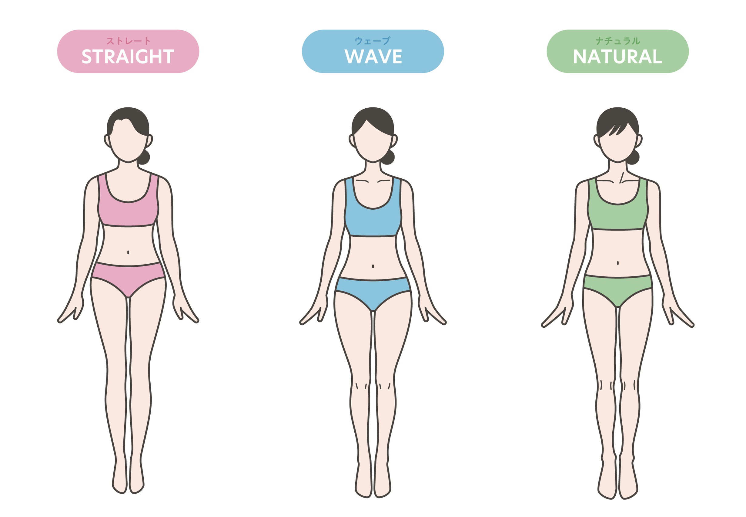 骨格診断は、骨のフレームや筋肉・脂肪のつき方、体の厚みやバランスを総合的に分析し、ストレート・ウェーブ・ナチュラルの3タイプに分類します。